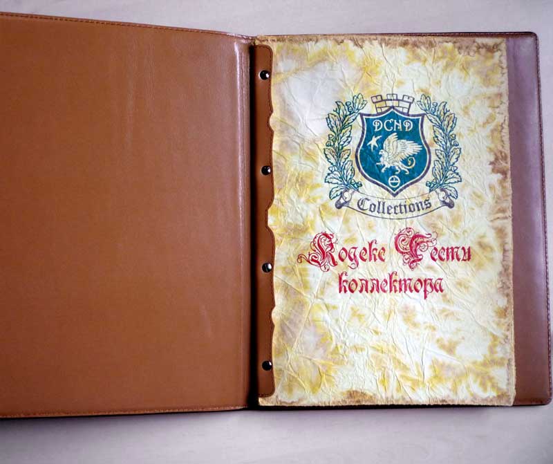 Кожа с тиснением, дизайнерская бумага ручной работы, шелкотрафаретная печать.